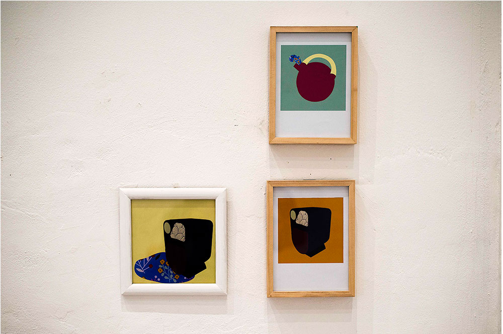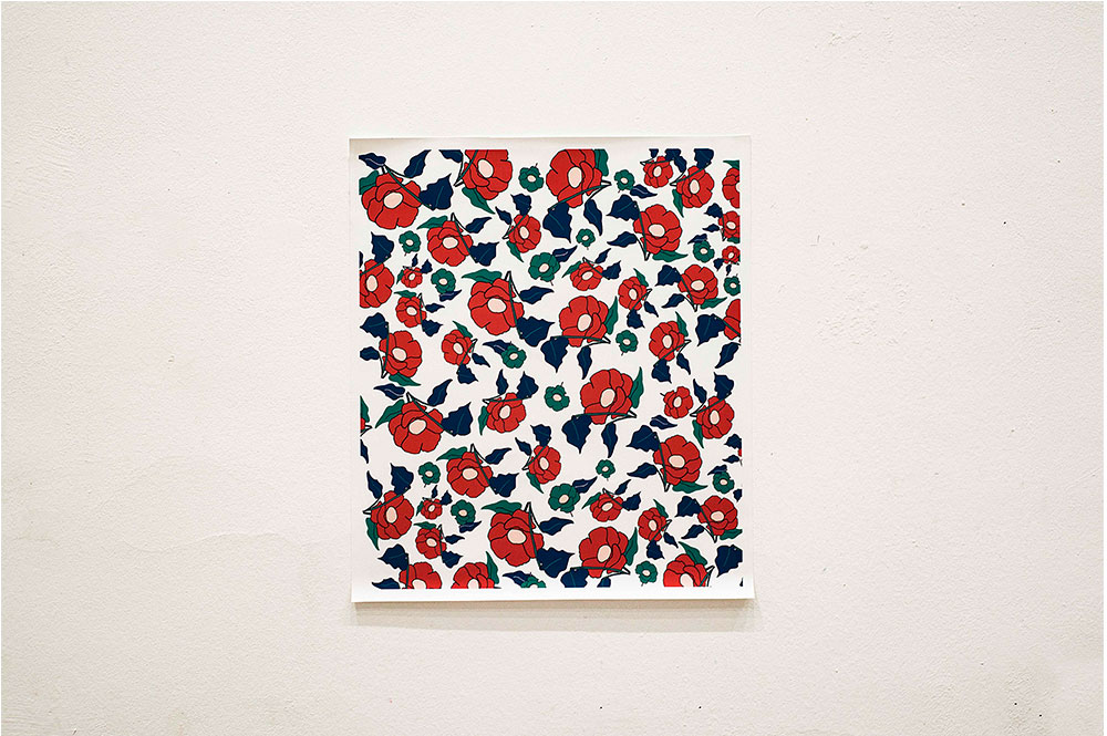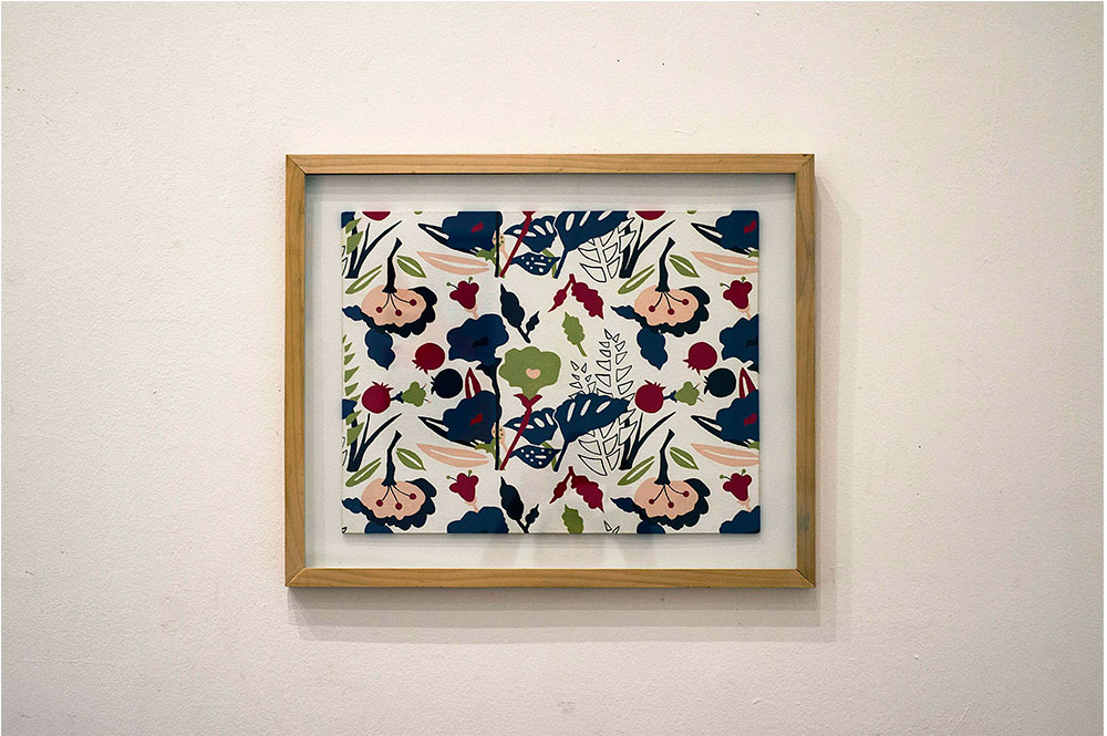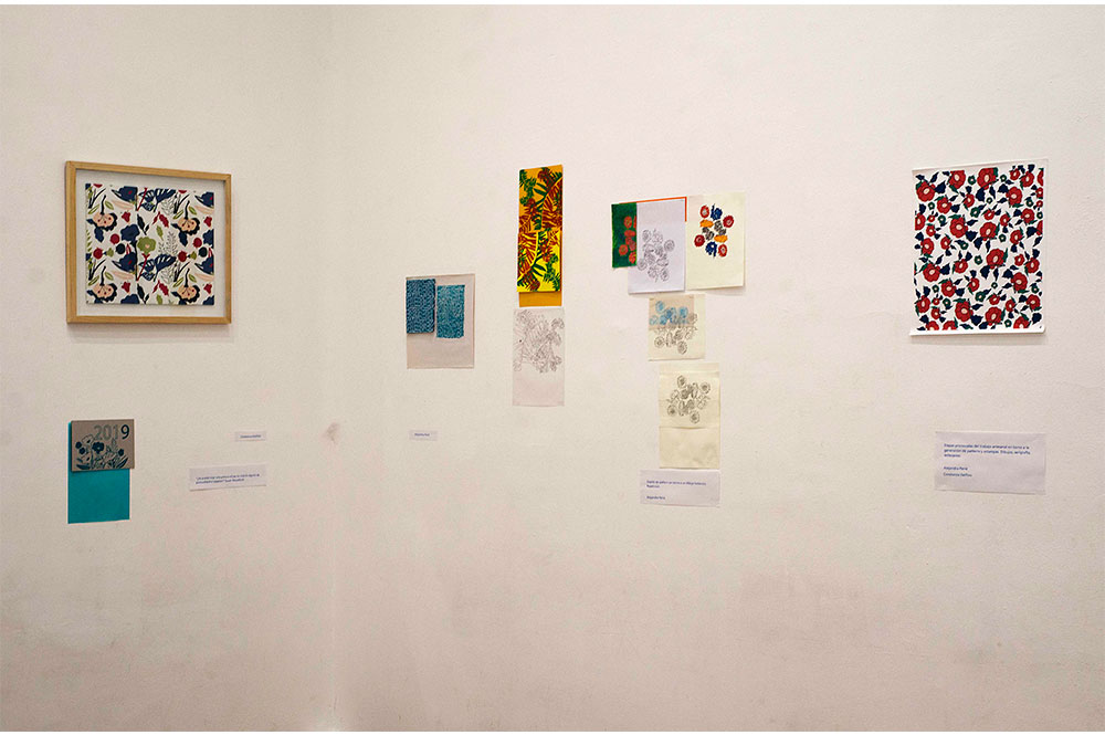 Podríamos decir que esta muestra reúne (i) patterns digitales impresos, hechos para tazas y otros; (ii) impresos en diferentes formatos exploratorios; (iii) objetos impresos antes de su confección, (iv) pinturas (cuadros) realizadas para explorar problemas de superficie, susceptibles de ser usados como pattern (v) pinturas hechas con marcadores y anotaciones de procesos.